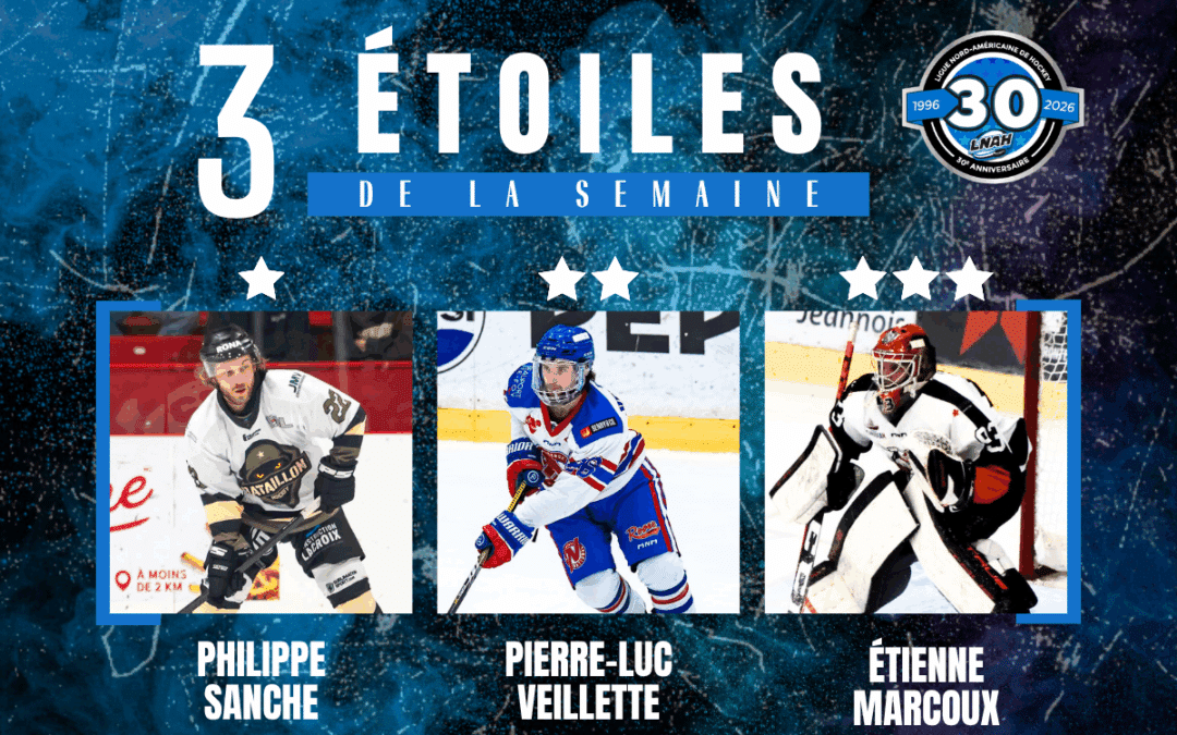 Philippe Sanche du Bataillon de Saint-Hyacinthe (1ère étoile), Pierre-Luc Veillette du National de Québec (2ème étoile) et Étienne Marcoux de l’Assurancia de Thetford (3ème étoile) sont les joueurs qui se sont illustrés lors de la dernière semaine.
